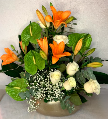 Arranjo pirâmidal com rosas importadas brancas, lírios laranjas, mosquitinhos, galhos de antúrios verdes e verdes. Em cachepó plástico redondo.