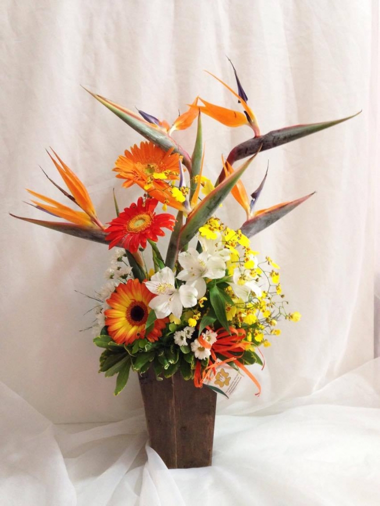 Arranjo de gérberas mistas, astromélias, orquídeas, estrelícias e verdes no cachepô.