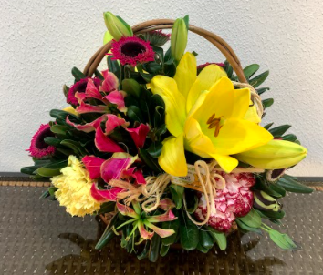 Cesta colorida com lírios amarelos, astromélias cor de rosa, cravos mistos, miolos de gérberas cor de rosa pink e verdes.