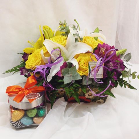 Arranjo com 5 rosas importadas amarelas, lírios amarelos e brancos, alstromélias roxas e verdes no cachepô de papel. Chocolate a parte.