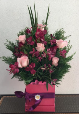 Arranjo pirâmidal com 6 rosas nacionais cor de rosa, astromélias roxas escuro e verdes. Em caixa de papel quadrada rosa pink, com laço de cetim roxo escuro.