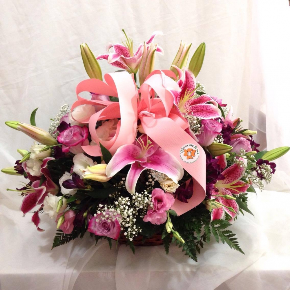 Cesto de rosas nacionais, lírios e lisiantus cor-de-rosa,e brancos, mosquitinhos e verdes em cachepô redondo.