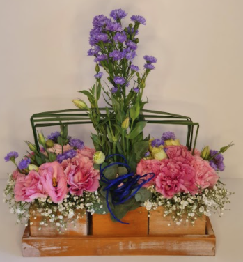 Arranjo com cravineas e lisiantus cor de rosa claro e lilas, mosquitinhos, estatícias e verdes. Em cachepó de madeira triplo quadrado.