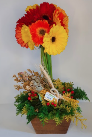 Arranjo com gérberas amarelas, vermelhas e laranjas, hipéricos e verdes. Em cachepó de madeira quadrado.
