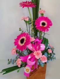 Arranjo pirâmidal em tons de rosa com gérberas pink, cravineas rosa claro e verdes fórmios e eucalípitos. Em cachepó de madeira quadrado.