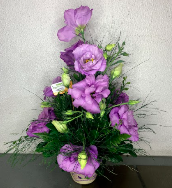 Arranjo pirâmidal com lisiantus lilas e aspargos. Em cachepó de cerâmica redondo.