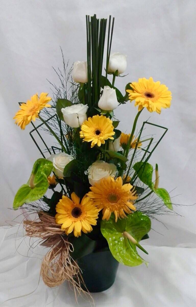 Arranjo com 7 rosas nacionais brancas, gérberas amarelas, antúrios verdes e verdes no vaso de alumínio colorido.