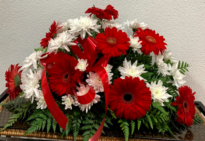 Arranjo funeral com gérberas vermelhas, crisantemos brancos e verdes em base plástica.