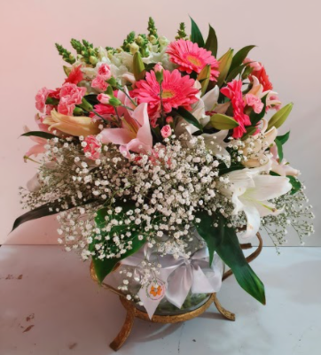 Arranjo funeral redondo com lírios brancos e cor de rosa, mosquitinhos, gérberas cor de rosa, boca de leão branca e verdes, em base de cerâmica.