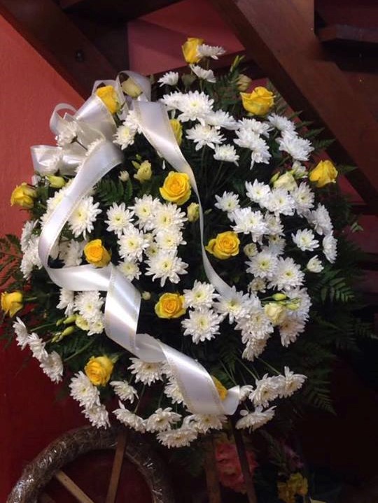 Coroa com rosas importadas amarelas, crisantemos brancos e verdes.