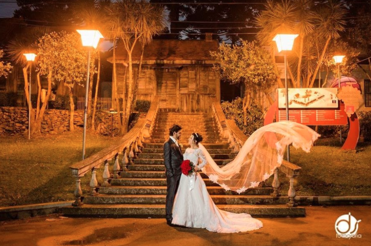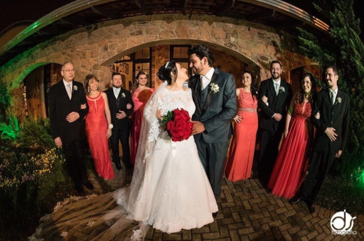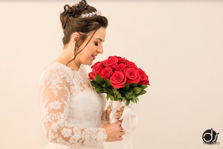 Buquê de noiva redondo com rosas vermelhas importadas e verdes. Com detalhe em cetim branco com pérolas no caule.