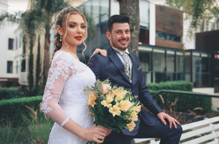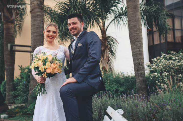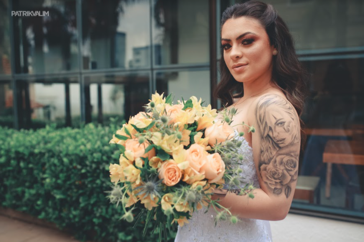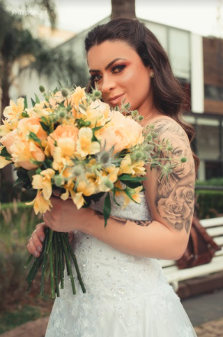 Buquê de noiva redondo com rosas importadas e astromélias champgne, pompons verdes e verdes. Com detalhe em cetim verde no caule.