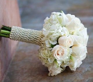 Buquê de noiva redondo com rosas nacionais brancas e ortências brancas, com detalhes em pérola no caule.