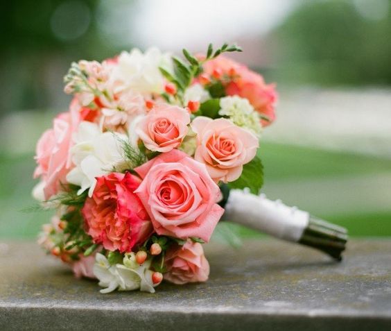 Buquê de noiva redondo com flores diversas em tons branco, rosa, salmão e laranja, tais como rosas, frésias e hipéricos, com detalhe de cetim branco no caule.