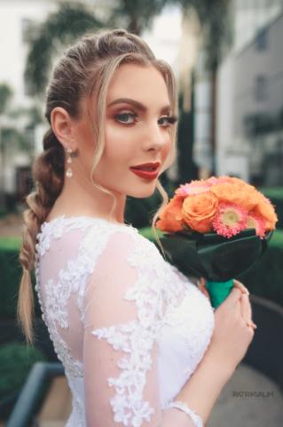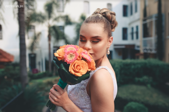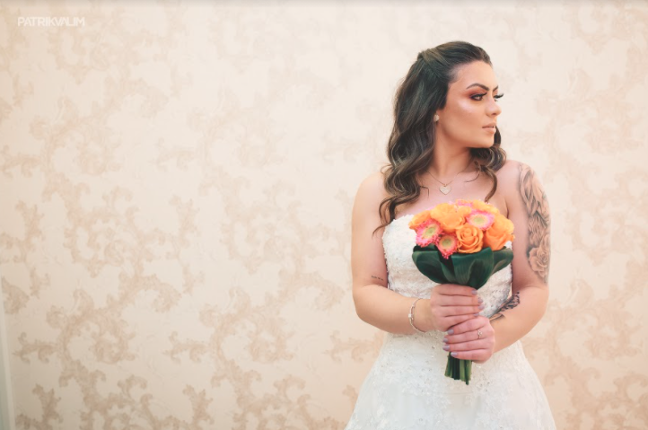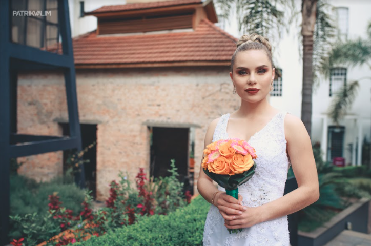Buquê de noiva redondo com rosas laranjas, miolo de gérberas e verdes. Com detalhe em cetim verde no caule.
