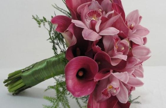 Buquê de noiva redondo com callas e orquídeas com detalhes em cetim verde no caule.
