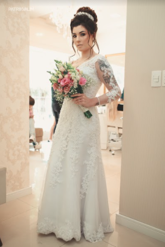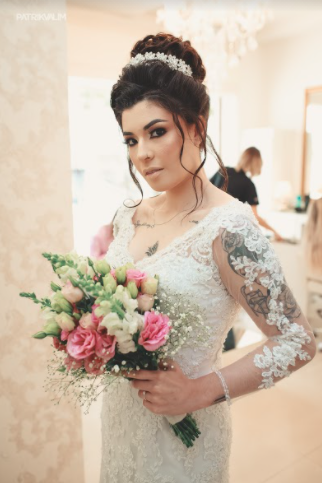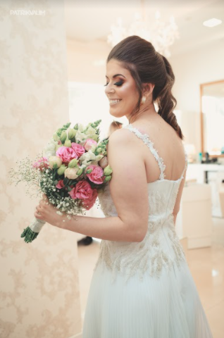 Buquê de noiva pirâmidal com boca de leão brancas, rosa cor de rosa, mosquitinhos e verdes. Com detalhe em cetim branco com pérolas no caule.
