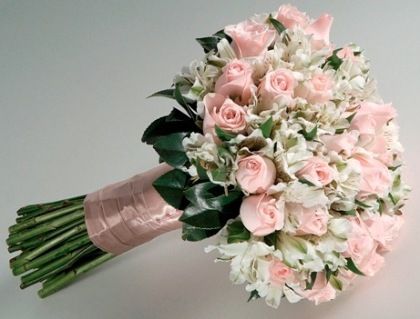 Buquê de noiva redondo com rosas nacionais claras, astromélias brancas e verdes, com detalhe em cetim rosa claro no caule.