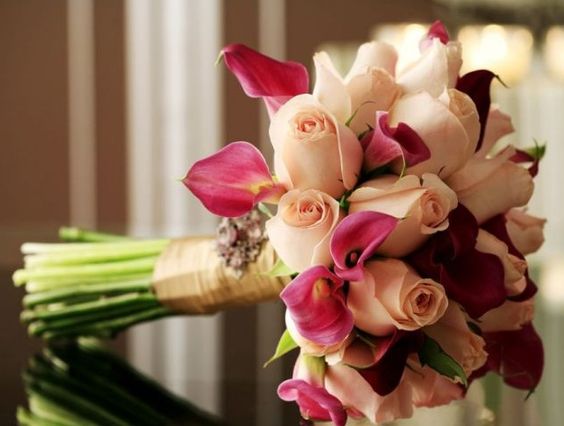 Buquê de noiva redondo com rosas nacionais champagne e callas rosa antigo, com detalhe em cetim dourado.