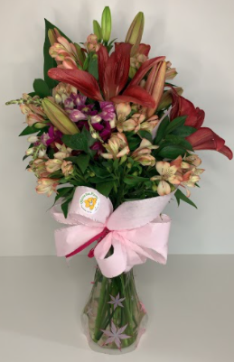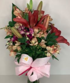 Vazú estampado com lírios vermelhos, astromélias creme e roxas, e ruscus. Enfeitado com um laço cor de rosa.