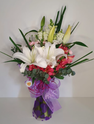 Vazú de lírios e bocas de leão brancos, astromélias cor de rosa e verdes. Enfeitado com um laço roxo.