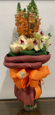 Buquê redondo com galhos de orquídea verdes, rosas nacionais champagne, bocas de leão laranjas e verdes. Embalado em papel crepom morrom e laço laranja.