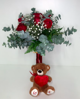 Buquê com rosas vermelhas nacionais, mosquitinhos e verdes. Com detalhe no caule com cetim vermelho.