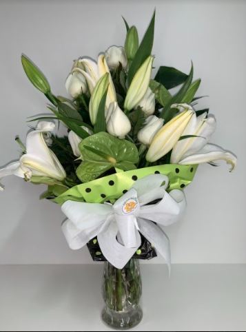 Buquê de braçada com lírios e rosas nacionais brancas, galhos de antúrios verdes e verdes. Embalado em papel poa verde.
