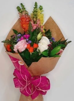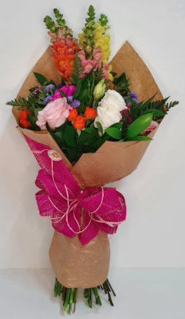 Buquê misto com rosas nacionais cor de rosa e brancas, mini rosas laranjas, boca de leão laranjas, rosas e amarelas, estatícias coloridas e verdes. Embalado em papel pardo e enfeitado com laço cor de rosa pink.