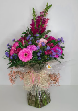Buquê aspiral misto com gérberas cor de rosa, boca de leão roxo, mini rosas lilás e verdes. Embalado em papel celofane transparente.