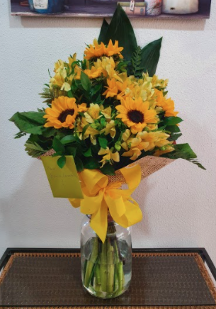 Buquê de braçada com girassóis, astromélias amarelas e verdes. Embalado em papel celofane estampado.
