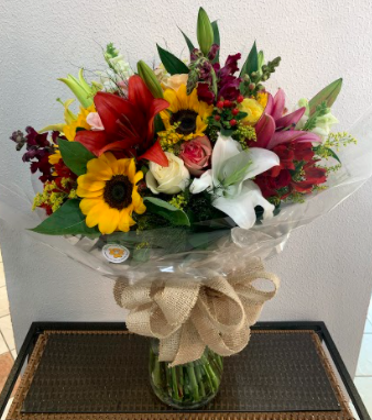 Buquê redondo misto com lírios vermelhos e brancos, girassóis, rosas nacionais mistas, bocas de leão mistas, hipéricos, rusucs e verdes. Embalado em celofane transparente.