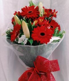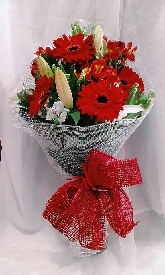 Buquê de braçada com gérberas vermelhas, lírios brancos, astromélias brancas e vermelhas, e verdes.