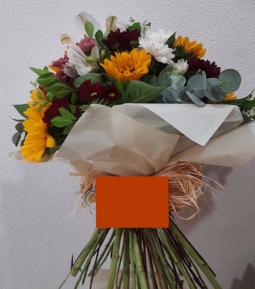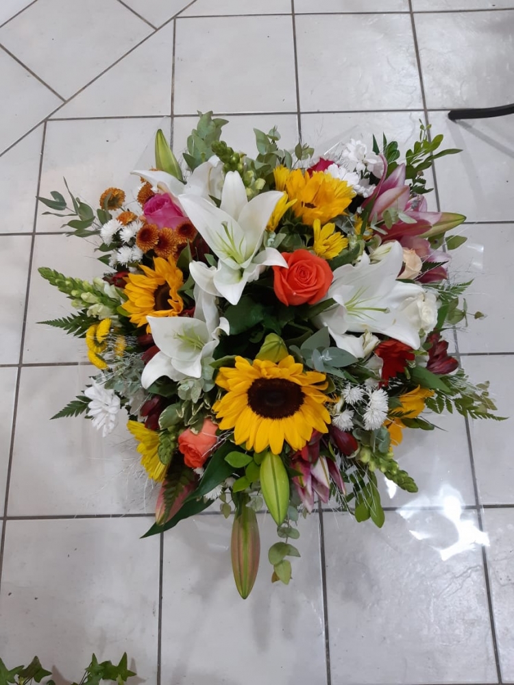 Um lindo e grande buquê com lírios brancos, girassóis, lírios rosa, boca de leão branca, flores do campo, gérberas coloridas, rosas nacionais coloridas, eucaliptos e verdes.
