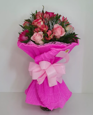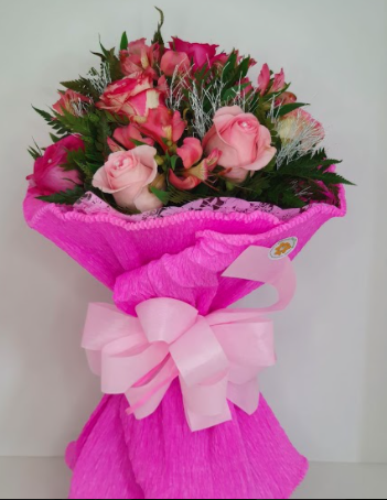 Buquê redondo com 10 rosas importadas rosa claro, astromélias chiclete, aspargos brancos e verdes. Embalado em papel crepom rosa.