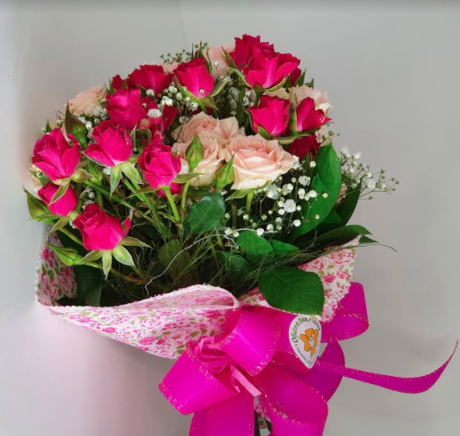 Buquê redondo com mini rosas cor de rosa pink e claro, mosquitinhos e verdes. Embalado em celofane estampado.
