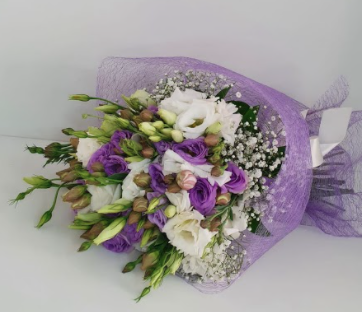 Buquê redondo com lisiantus brancos e lilás, mosquitinhos e verdes. Embalado em tela lilás.