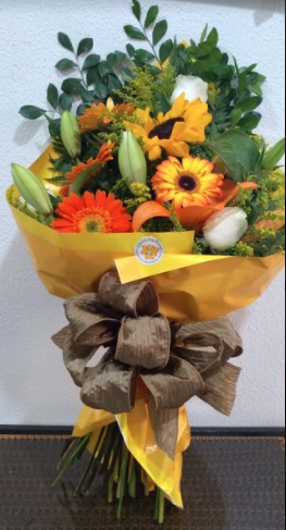 Buquê misto com gérberas amarelas e laranjas, lírios mistos, girassóis, rosas nacionais brancas e verdes. Embalado em celofane amarelo.