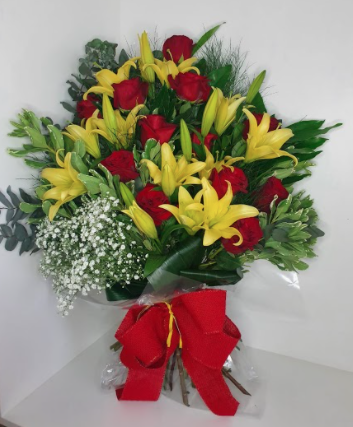Buquê de braçada com 14 rosas nacionais vermelhas, lírios amarelos, mosquitinhos e verdes. Embalado em celofane transparente e laço vermelho.