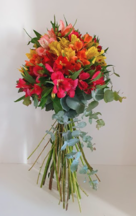 Buquê de astromélias mistas em tons de rosa, vermelho, amarelo e laranja, e verdes.