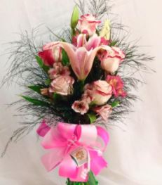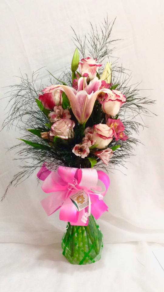 Vazú com 5 rosas importadas mescladas, alstromérias cor-de-roda, lírios e aspargos.