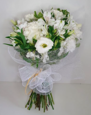 Buquê redondo branco com lisiantus, astromélias e verdes. Embalado em tela branca.