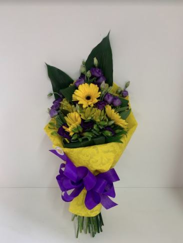 Buquê de braçada com gérberas e astromélias amarelas, lisiantus roxos e verdes. Embalado em celofane amarelo.