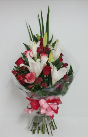 Buquê de braçada com rosas nacionais vermelhas e mescladas, lírios brancos e verdes. Embalado em papel celofane transparente.