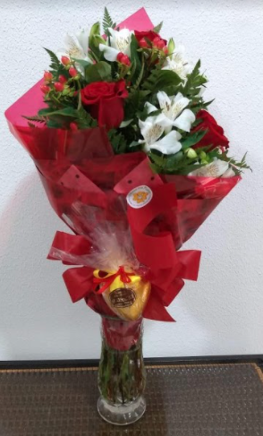 Buquê com rosas importadas vermelhas, astromélias brancas, hipéricos e verdes. Embalado em papel celofane vermelho.