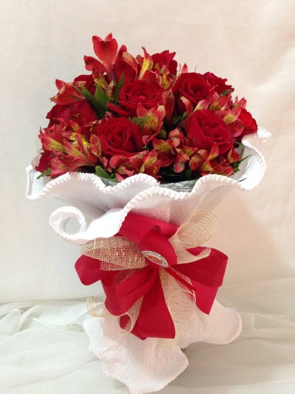 Buquê redondo com 8 rosas importadas vermelhas, astromélias vermelhas e verdes.