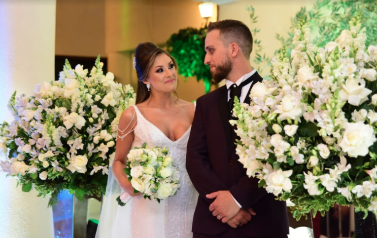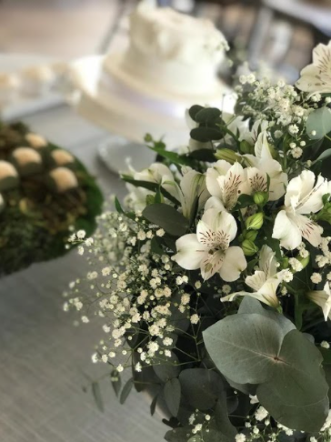 Decoração com astromélias, rosas importadas, bocas de leão, mosquitinhos e verdes, em ramalhetes baixos e arranjos altos em tulipas.