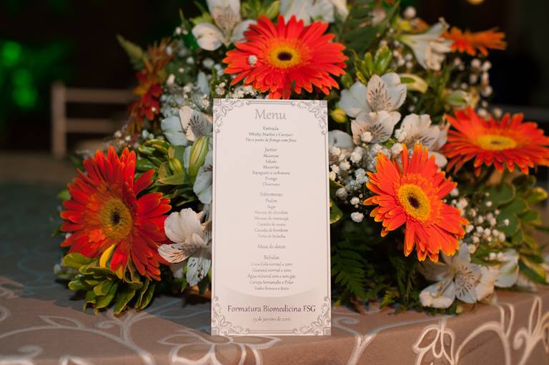 Decoração em mesa de convidados com gérberas laranjas e astromélias brancas.