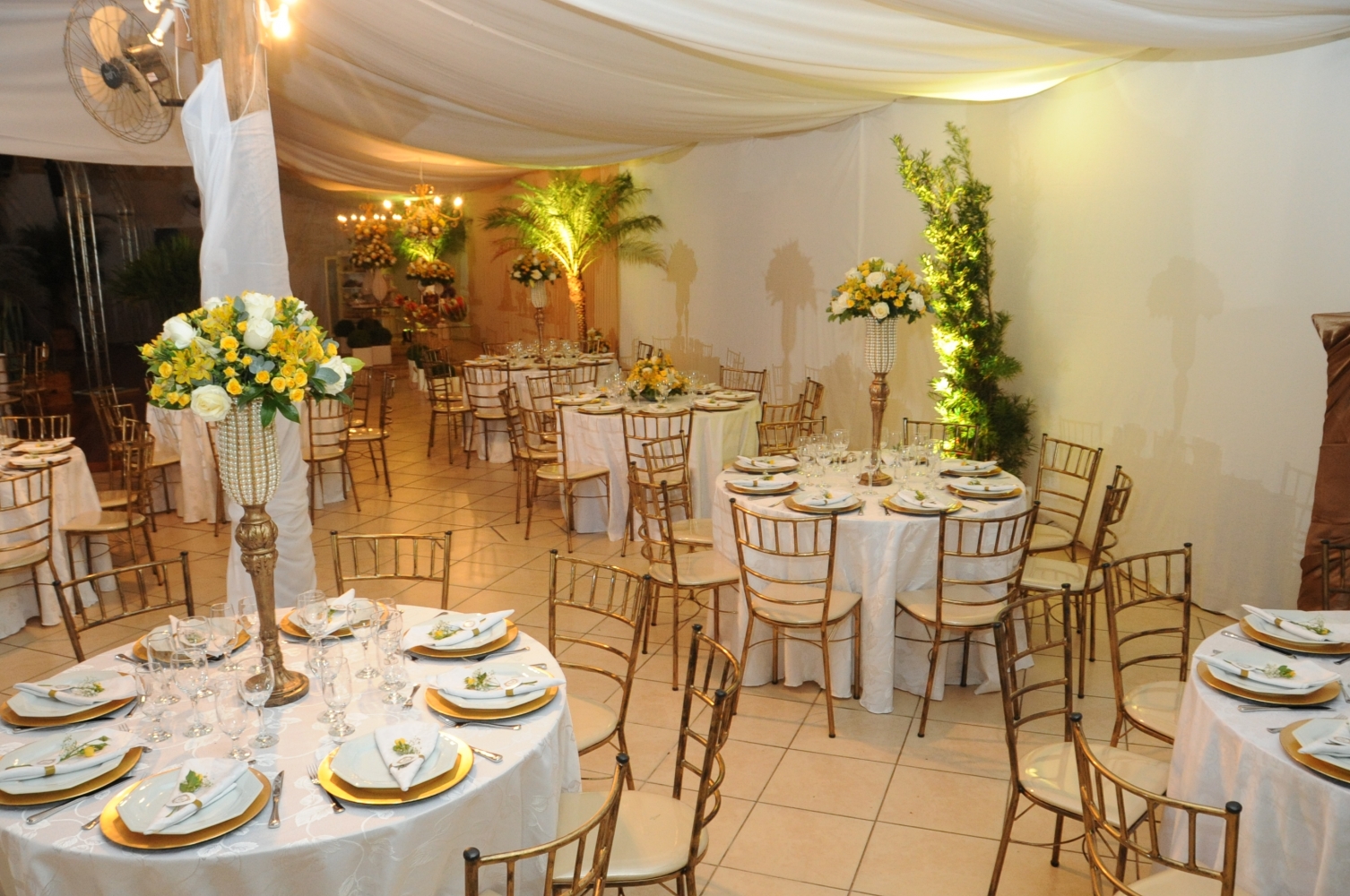 Decoração com flores amarelas e brancas em mesa dos convidados, lustres, mesa de doces, mesa de frutas e mesas de centro.