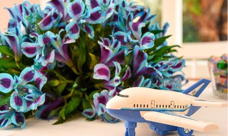 Decoração na mesa de doces com astromélias azuis.